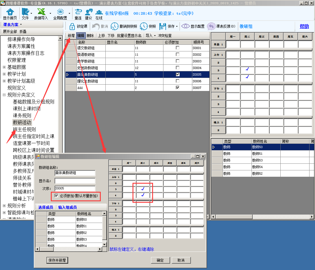 新建或编辑时右方课表中勾选此教研组的教研活动时间。