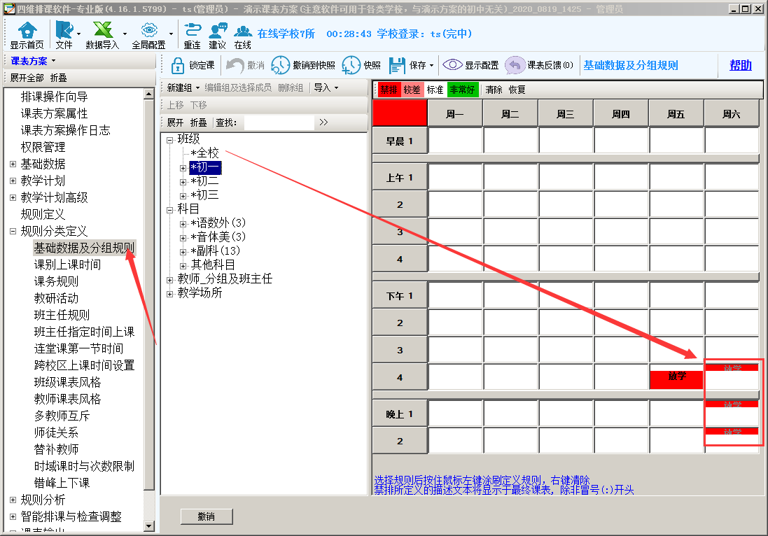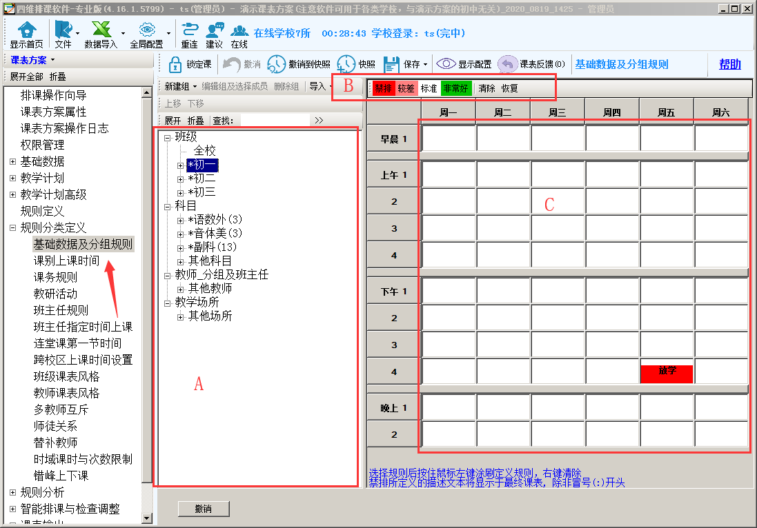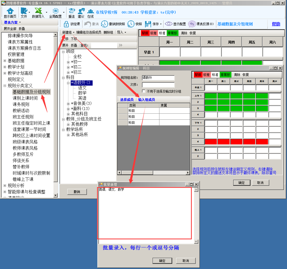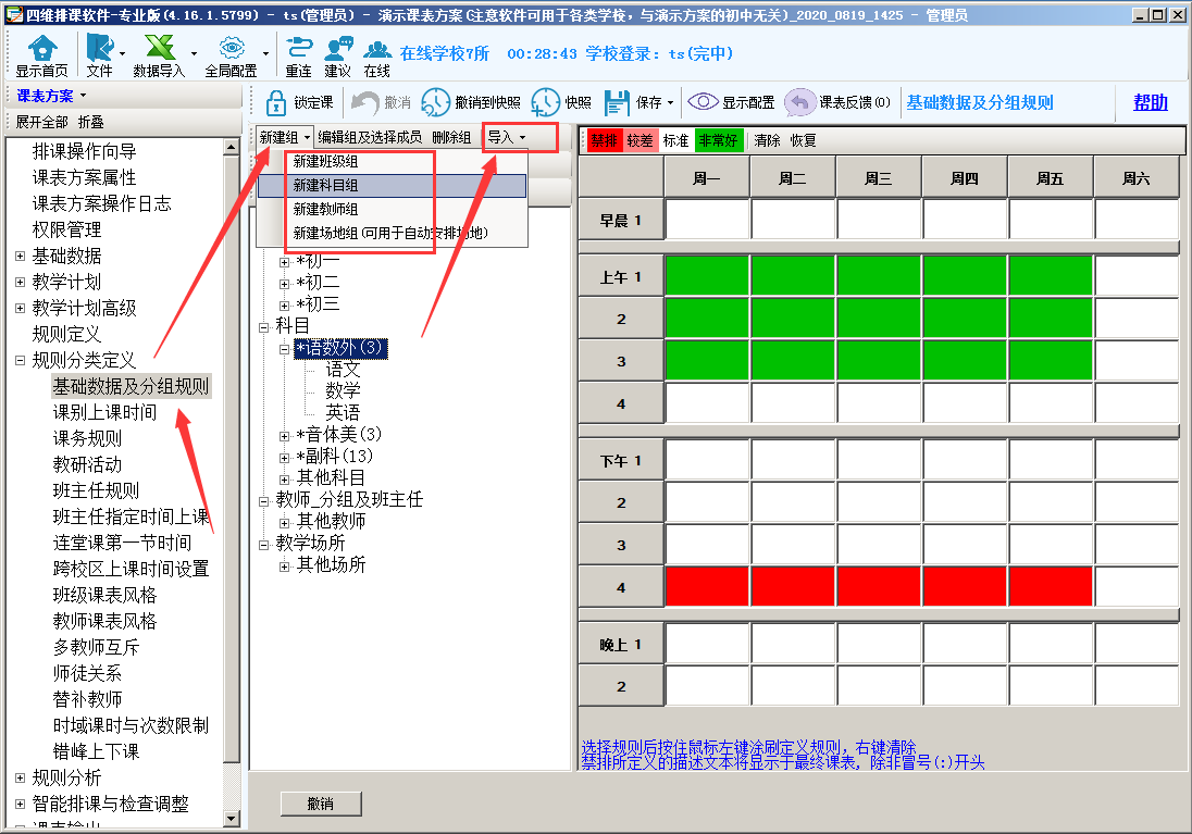 排课最重要的和需要灵活处理的就是规则,四维排课软件是一套普适的软件,软件并不会因为科目的名称是语文或数学就认为这个课更重要且需要安排在上午12节。