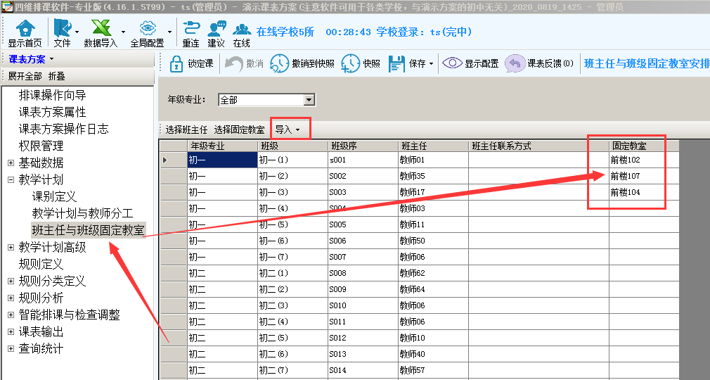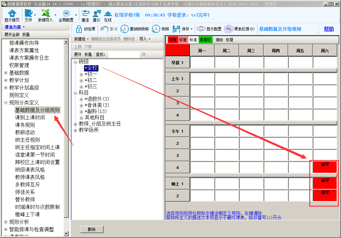 另要注意系统包括一些内置规则如早读与第一节课衔接、所有教多班级的教师授课进度对齐,所有课在班级均匀分布到每一天等。