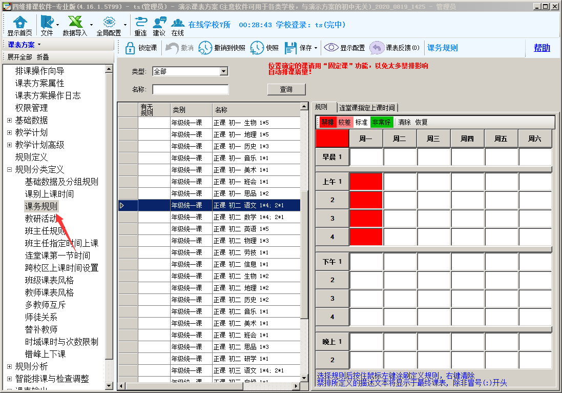 特别注意:规则的定义一定导致课表更难排出,所以一定要避免盲目定义规则,特别是禁排规则。四维排课软件支持极其丰富的规则类型,导致很多新手用户盲目定义规则导致排课失败。记住只在这个课绝对不能排某位置时才定义禁排规则,规则定义完成后可以通过系统如下两个功能做一般性分析,一定程度上能检查出不可能排出的课表。