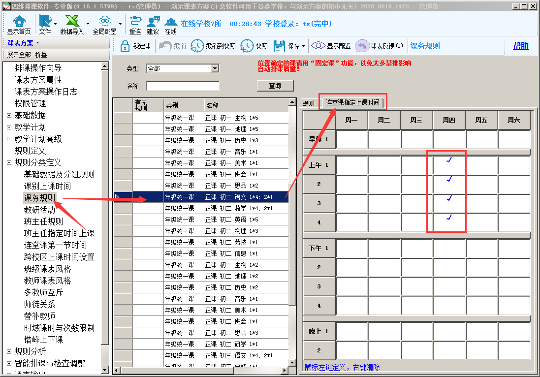 课务规则支持指定此课务中连堂课上课时间,如下图初二语文课由4次单节和一次连堂课构成,我们指定了这次连堂课只允许排在周四上午: