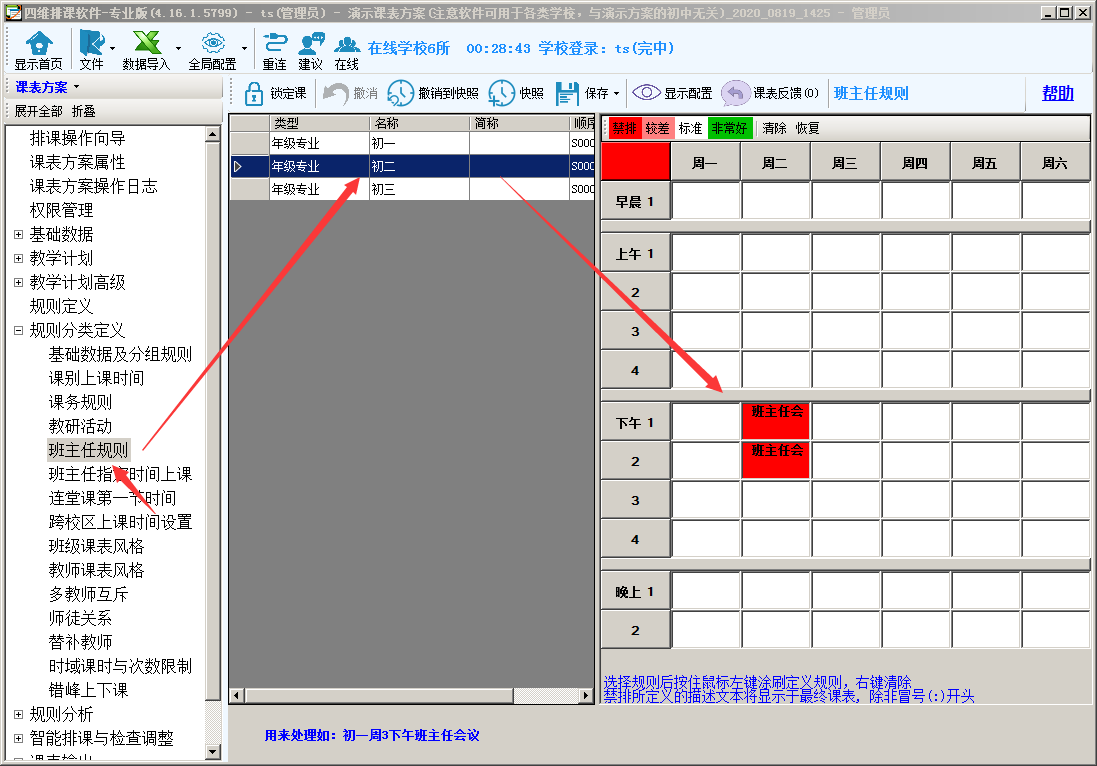 班主任指定时间上课用来约束比如周一上午第一节由各班级的班主任上课,此规则也是按年级专业设置: