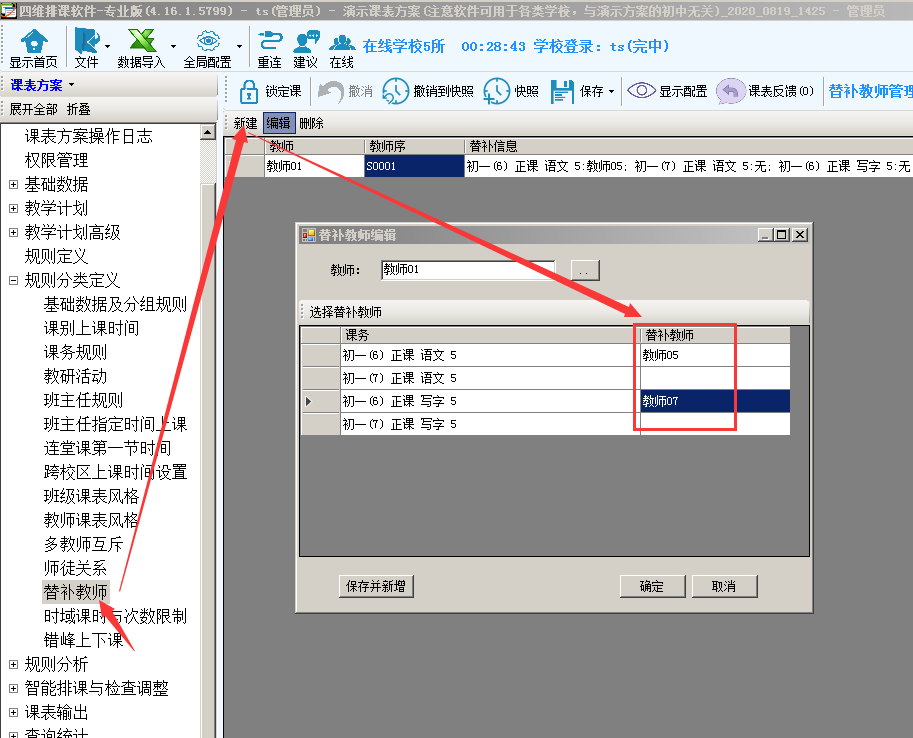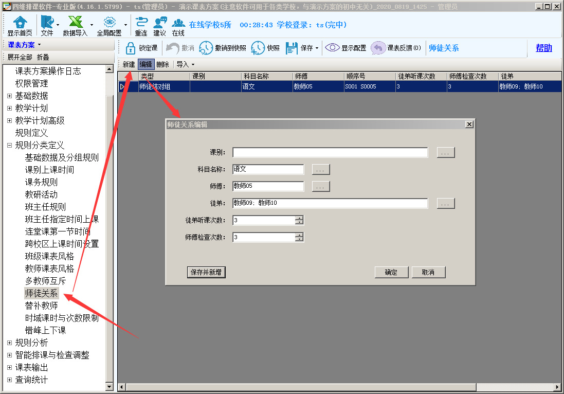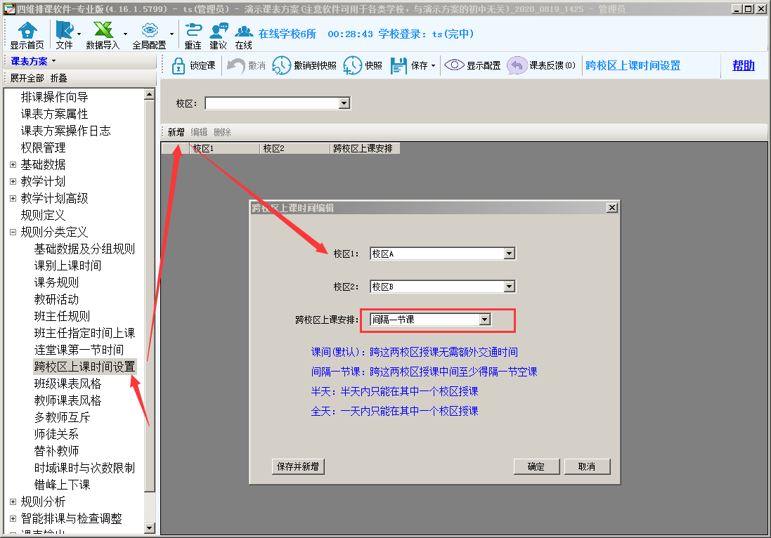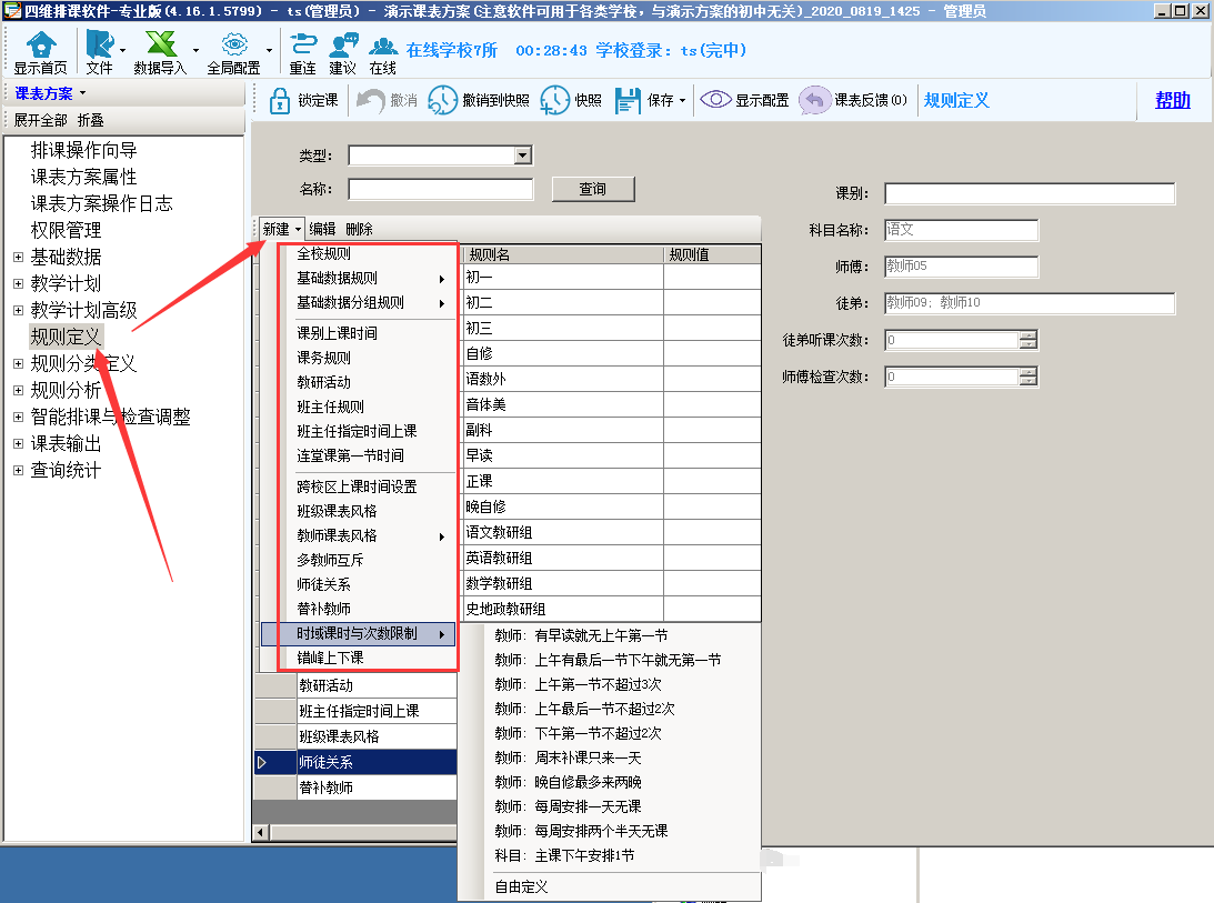 四维排课软件通过一般规则和相对规则能够比较全面地表达排课需求,一般规则是能够与具体时间点关联的规则,相对规则则是约束课节与课节间相互位置的规则。