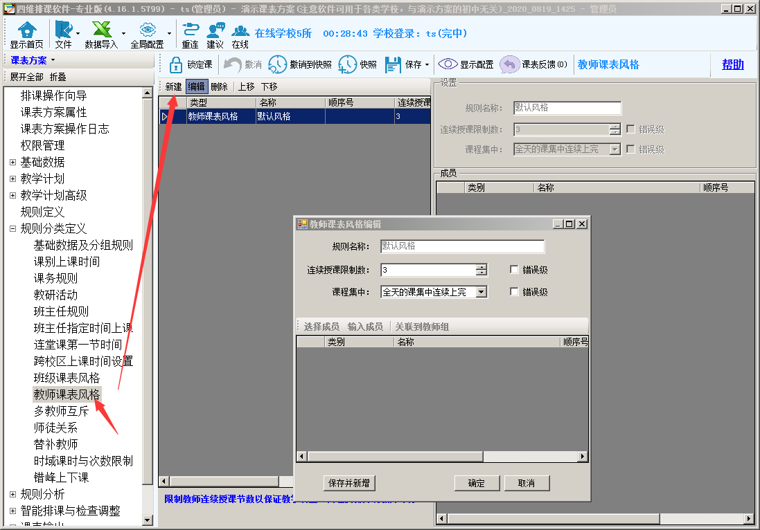 通过定义课表风格可以处理不同老师的要求,包括连续授课节数的限制,课程集中方式的选择。
