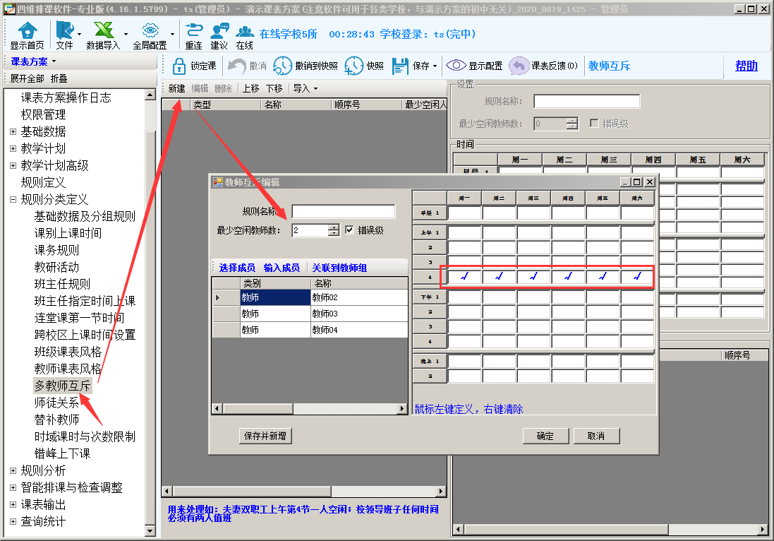 多教师互斥用来处理如双职工第4节只能有一人上课、校领导班子任何时刻至少两人不在上课等类似需求,设置时需要指定成员教师、指定互斥的时间: