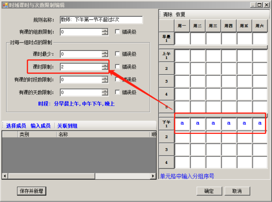 时间域:课表中每个课节填写一个标识,所有标识相同的课节构成一个时间域,如下午第一节不超过两次定义如下: