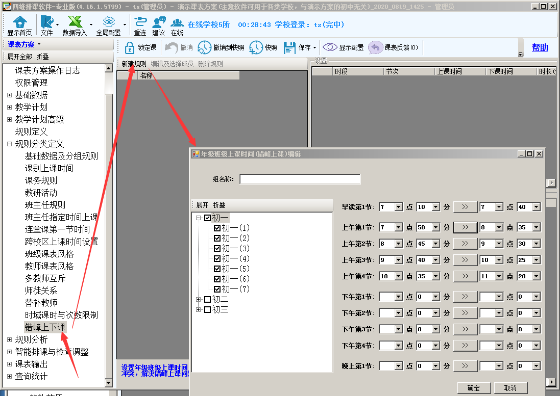 因为防疫或9年制低年级学生每天开始上课时间比较迟等原因,会导致垮年级老师出现在某年级下课后另一年级的班级已经开始上下节课了而时间冲突,所以软件提供错峰上下课功能,设置每个年级或班级的上下课时间,软件自动处理这种情况导致的冲突并会为教师预留10分钟课间: