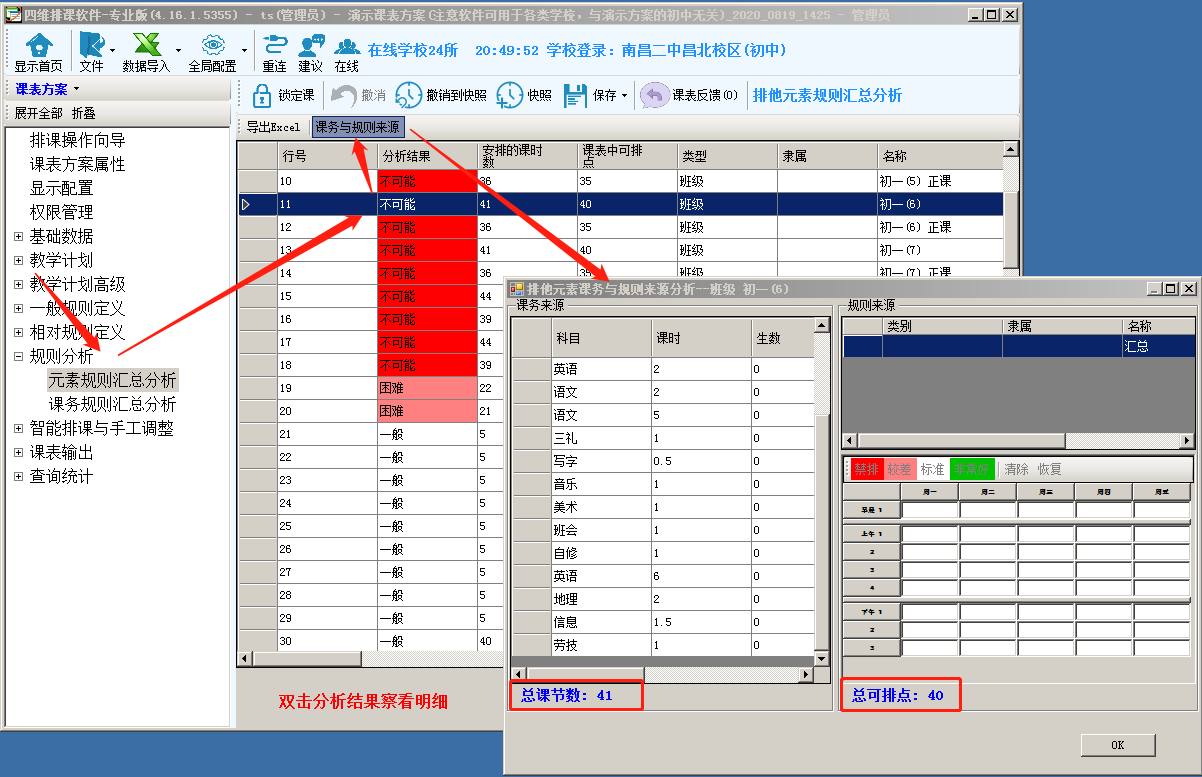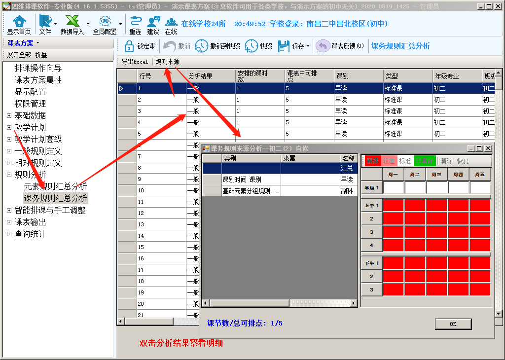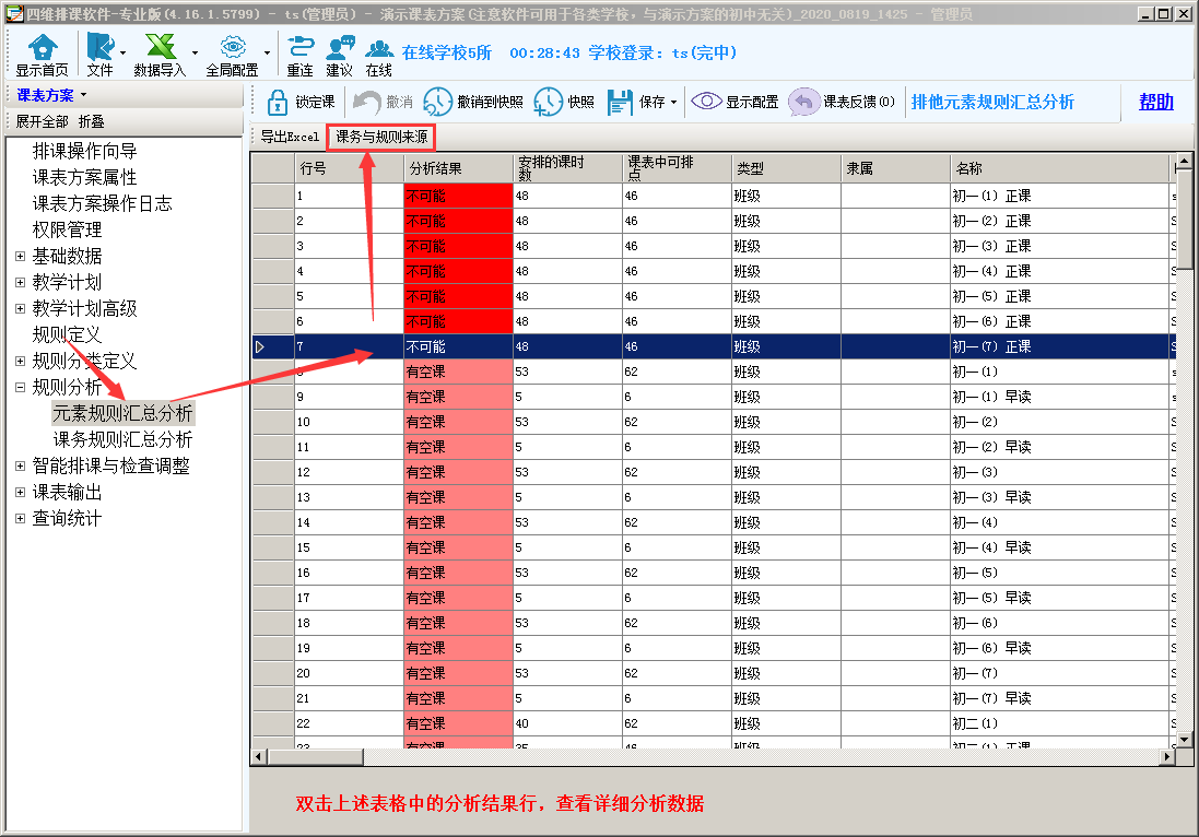 对分析的每行结果可以双击或点上方的“课务与规则来源”来查看明细,分析原因: