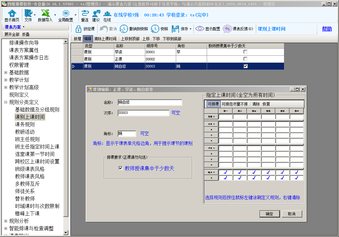定义各课别可以上课的时间,注意支持可排但尽量不排的设置。