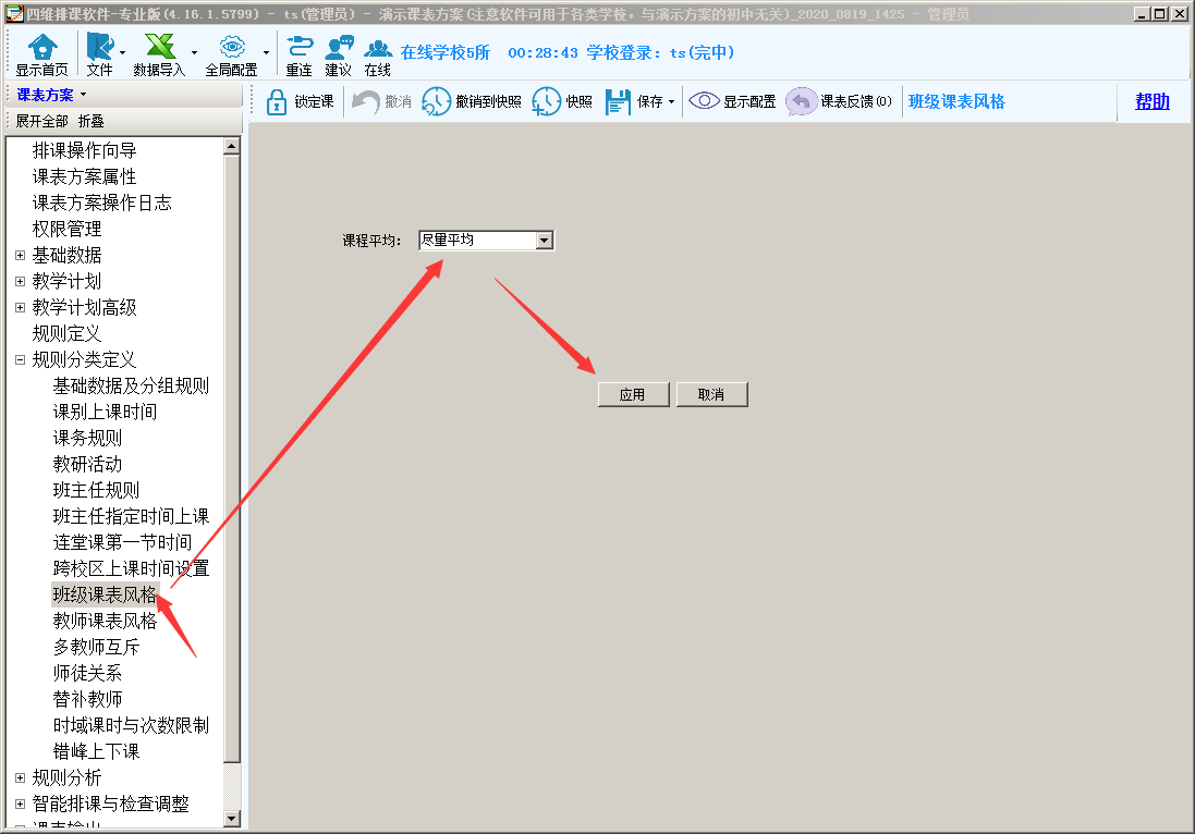 目前班级课表风格只支持全校设置课程平均规则,包括尽量平均(默认),严格平均。